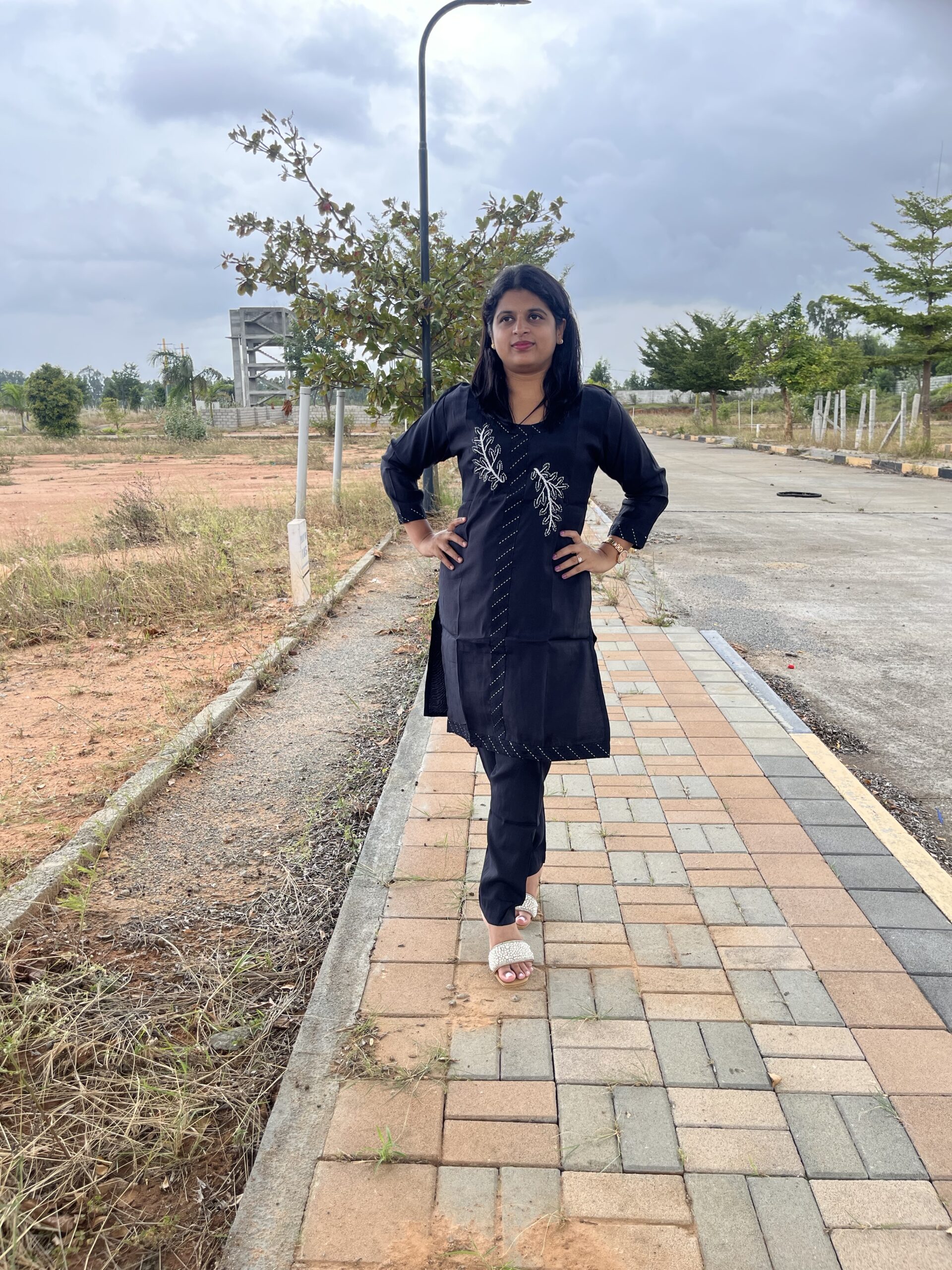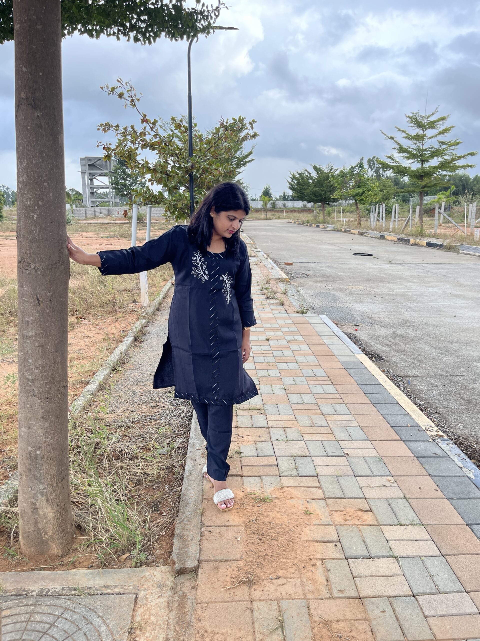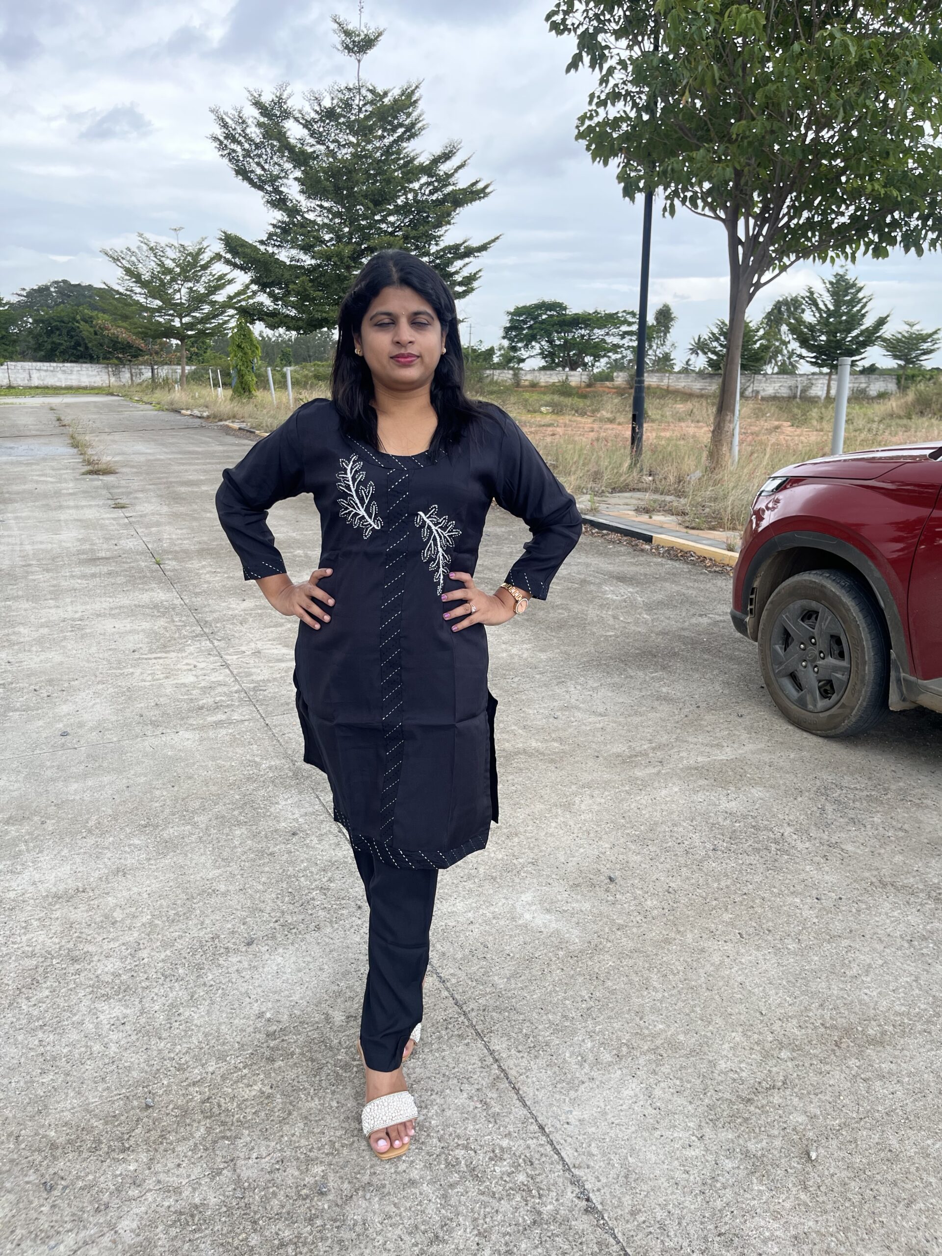 Redefine elegance with this graceful black co-ord set crafted from rich Roman Silk fabric. This stylish set features subtle handmade embroidery work on the kurta, giving it a classy and timeless appeal. Designed for comfort and sophistication, it’s a versatile choice for both festive occasions and evening wear.